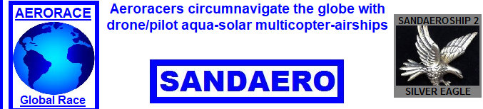 Aeroracers circumnavigate the globe with drone/pilot aqua-solar multicopter-airships: ultra low cost, modular cube-diamond, GPS-laser-radar-camera auto-navigating, overflying continental main cities and tourist attractions, under 1 km altitude.